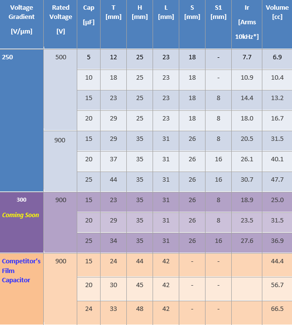 SPEZIFIKATIONENBei einem 900V-Produkt mit 20µF kann man mit der HPB-Serie, selbst bei einem Spannungsgradienten von 250V/µm, das Bauteilvolumen gegenüber heute üblicher 125°C-Folienkondensatoren um bis zu 30% reduzieren (Volumen 56,7cm³ --> 40,1cm³).